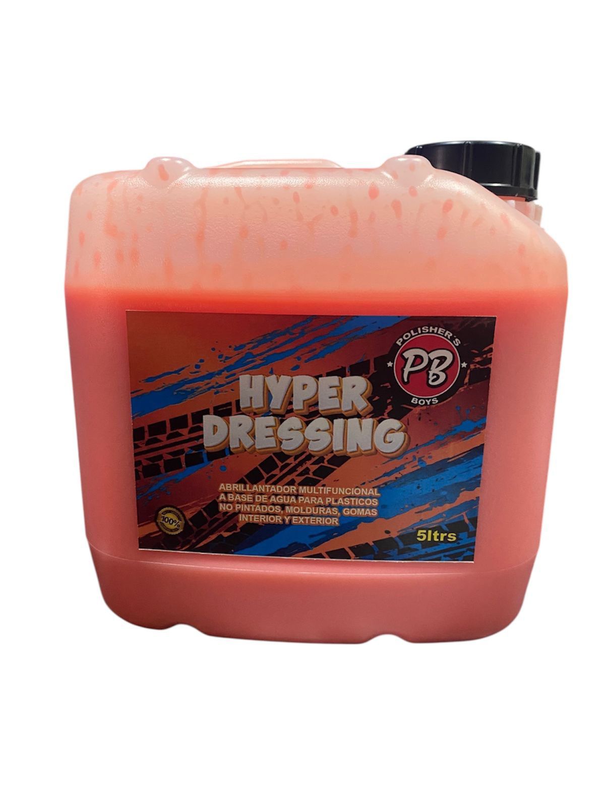 Hyper Dressing es un abrillantador multifuncional a base de agua, ideal para plásticos no pintados, molduras, gomas y paneles interiores o exteriores.